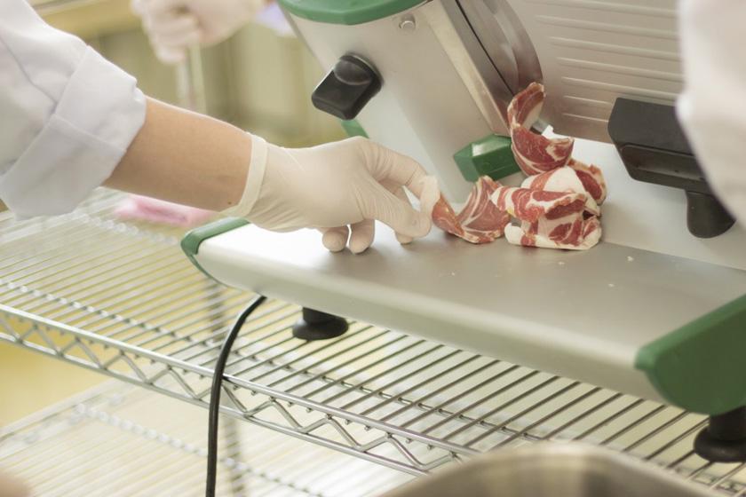 生徒もミートスライサーに挑戦。緊張しながらもしっかり使いこなしています。