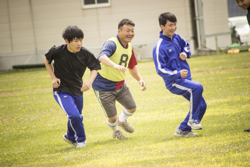 先生も結構本気で参戦します。生徒に混じってサッカーボールを本気で追いかける先生。先生に負けじと生徒も笑顔で追いかける。